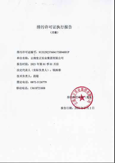 云南皇正實業集團有限公司2021年1-10月排污許可證執行報告月報