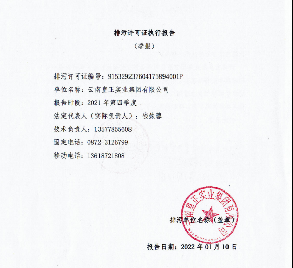 云南皇正實業集團有限公司2021年1-3季度排污許可證季報