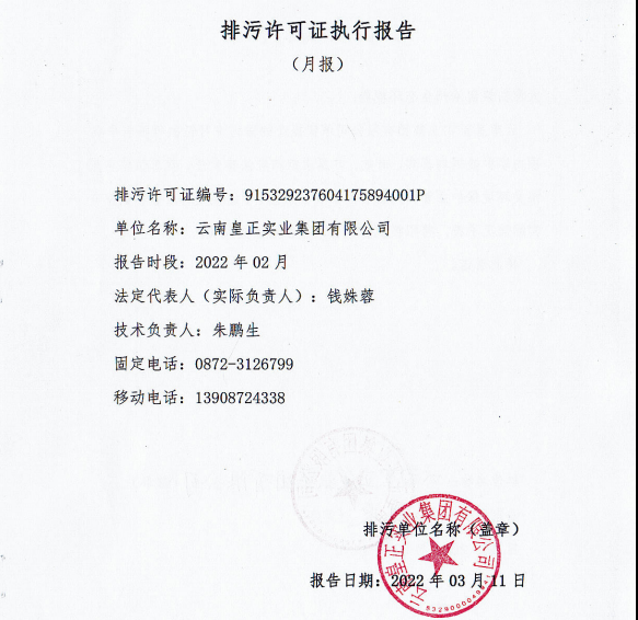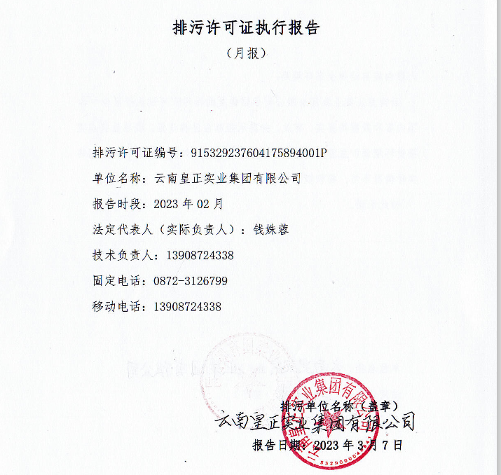 云南皇正實業集團有限公司排污許可執行報告2023年2月(月報)
