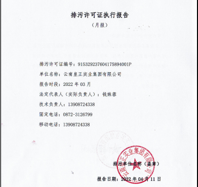 2022年云南皇正實業集團有限公司排污許可證季報 - 第一季度