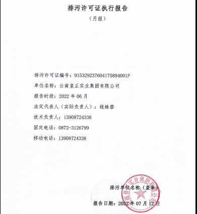 2022年云南皇正實業集團有限公司排污許可證季報 - 第二季度