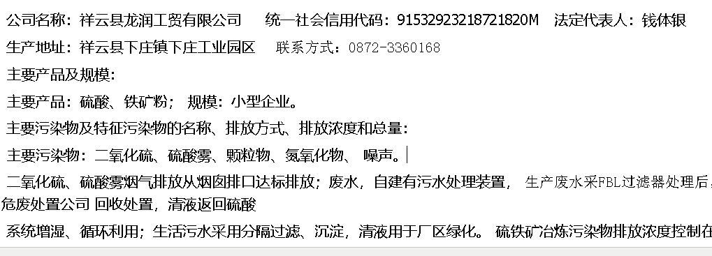 祥云縣龍潤工貿有限公司環保管理信息公開