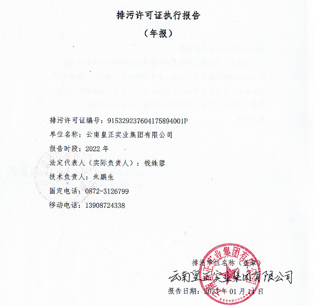 2022年云南皇正實業集團有限公司排污許可證季報 - 第四季度